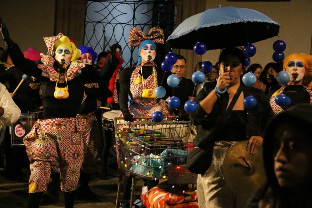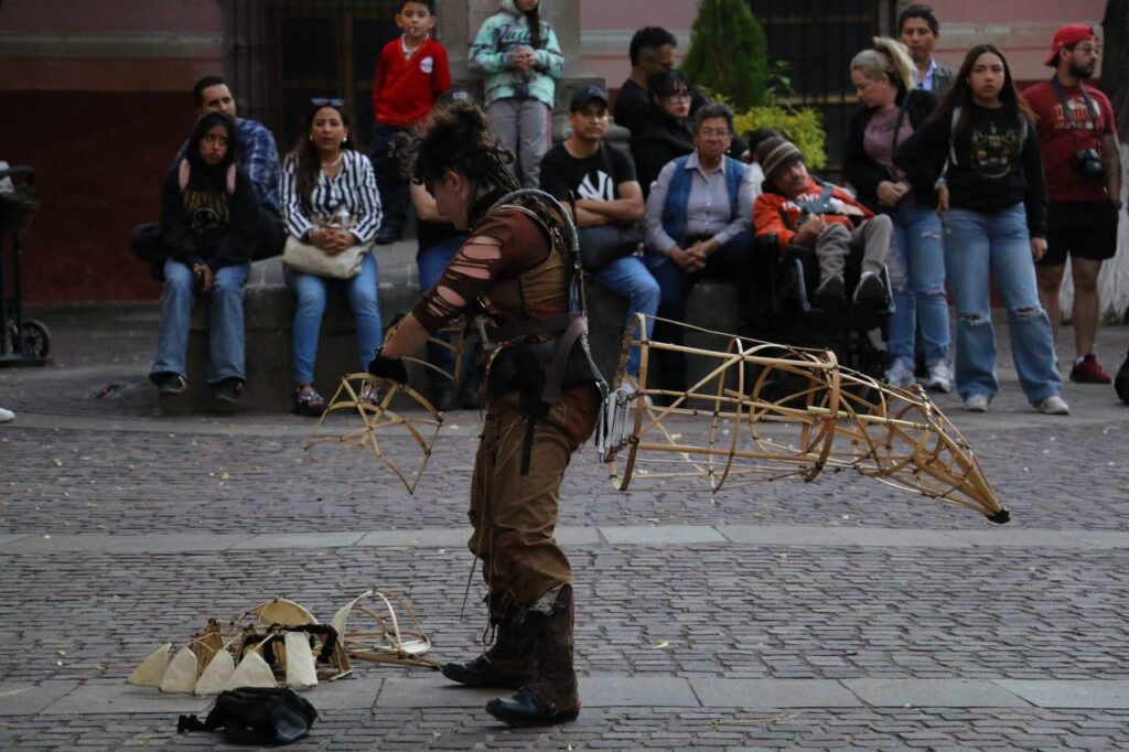 Simultáneamente, dos puestas en escena ocuparon distintos puntos de la ciudad. En la Plazuela del Moral, la compañía zacatecana Parvada Teatro presentó, una vez más, en este festival, “Del ombligo de Coatlicue”, mientras que Guía Nocturna emprendió su recorrido con “Bufones errantes: Turistas de lo absurdo”, un espectáculo itinerante que inició en el Jardín Juárez y llevó su humor irreverente por la Plazuela Genaro Codina, el Jardín Independencia y la Plaza Bicentenario.