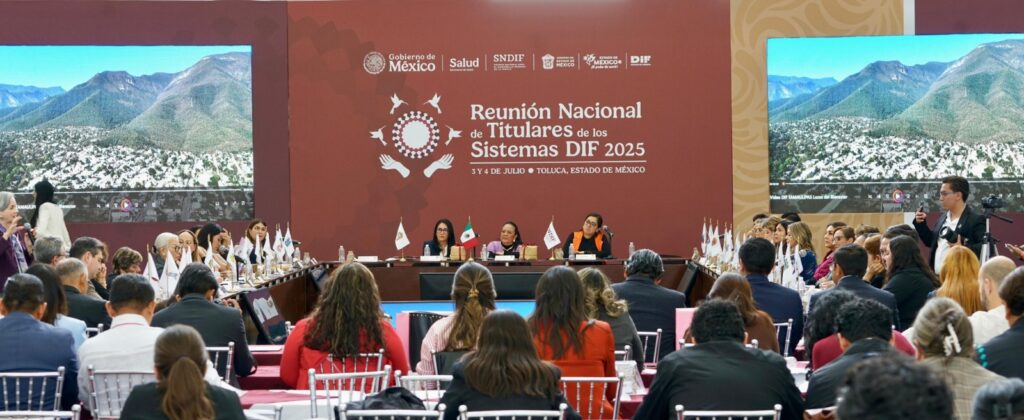 María del Rocío García Pérez, titular del Sistema Nacional para el Desarrollo Integral de la Familia (SNDIF), en presencia de Karina Labastida Sotelo, directora general del Sistema para el Desarrollo Integral de la Familia del Estado de México, convocó a las y los participantes a actuar con visión de transformación de la asistencia social, a fin de convertirlo en derechos.