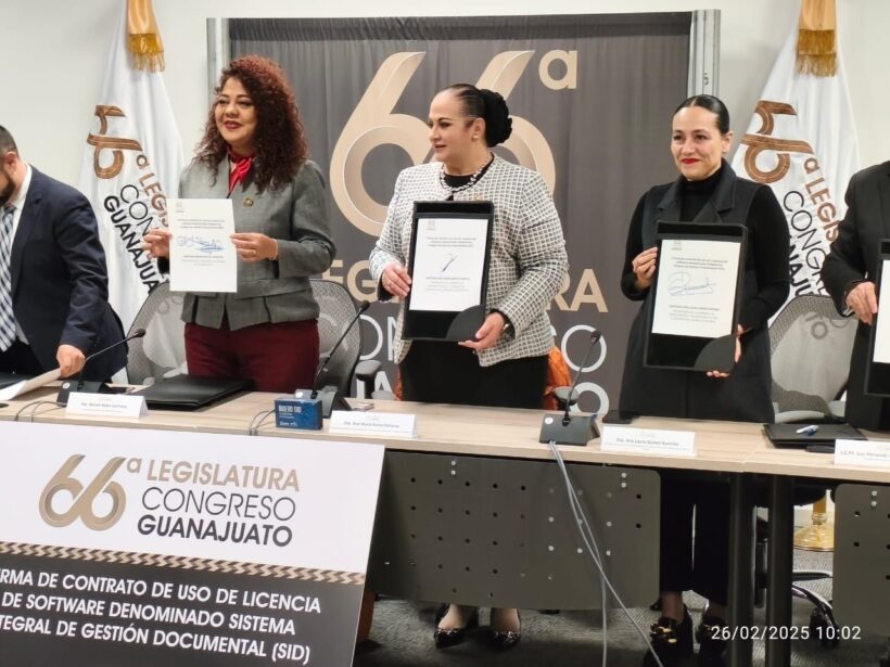 La LXV Legislatura del Estado de Zacatecas, a través de la Presidenta del Órgano de Administración y Finanzas, diputada Ana María Romo Fonseca, firmó el contrato de uso de la licencia del Sistema Integral de Gestión Documental, SID, con el Congreso del Estado de Guanajuato. También acudieron el Presidente de la Junta de Coordinación Política, Jesús Padilla Estrada, la Presidenta de la Comisión Permanente, diputada Dayanne Cruz Hernández, y el Presidente de la Comisión de Parlamento Abierto, diputado Marco Vinicio Flores Guerrero.