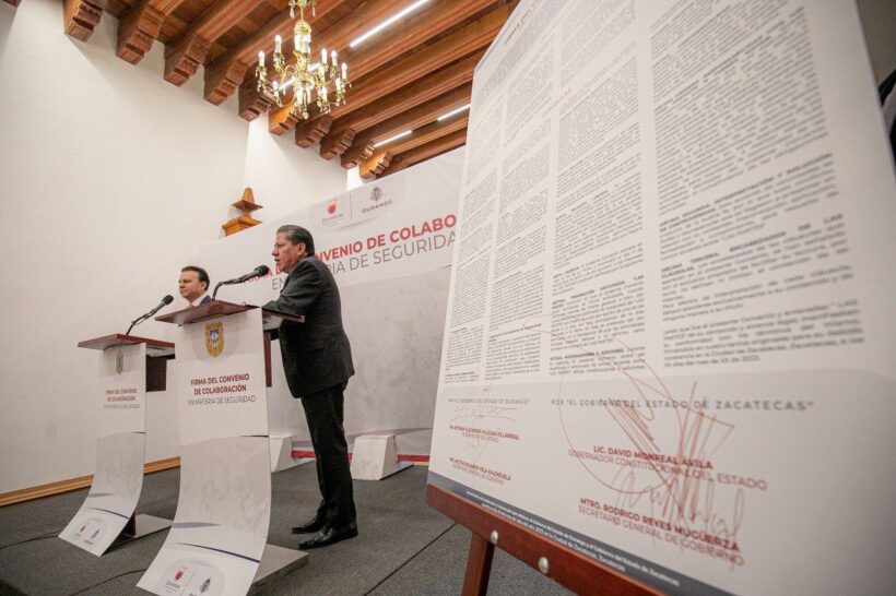 Para avanzar en los trabajos de pacificación y en la regeneración del tejido social, los Gobernadores de Zacatecas y Durango, David Monreal Ávila y Esteban Alejandro Villegas Villarreal, respectivamente, firmaron el convenio de colaboración en materia de seguridad entre ambos estados vecinos, con el objetivo de reforzar las acciones conjuntas en materia de combate a la delincuencia.