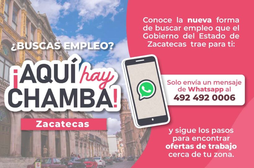 A través de la Secretaría de Economía, el Gobierno del Estado de Zacatecas puso en marcha la plataforma “Aquí Hay Chamba”, una herramienta que, a través de la plataforma Whatsapp, ayudará a los ciudadanos que están en busca de un empleo formal a encontrarlo de una manera más fácil y accesible.