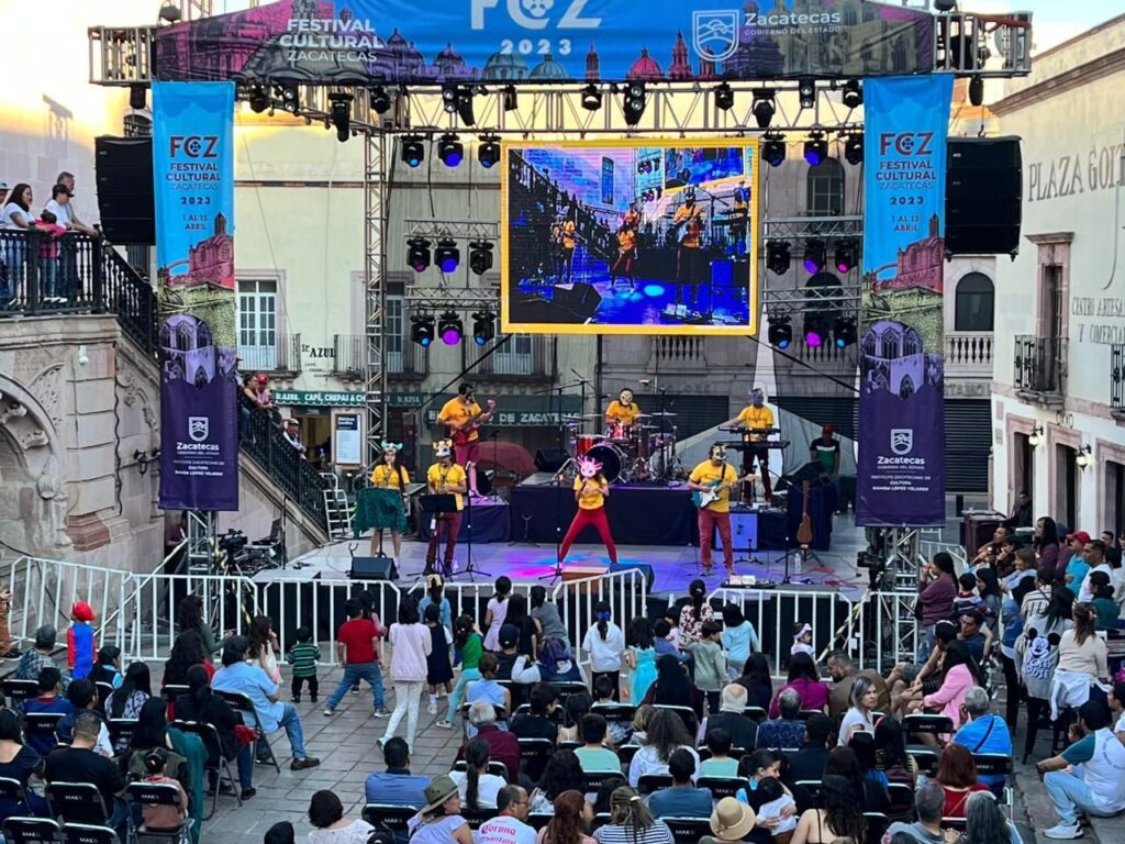 En la Plazuela Goitia, foro que por la tarde está dedicado a las infancias, la agrupación Vibra Muchá presentó un concierto de música mestiza, con esencia de reggae, ska, jazz, rocksteady, rap y son jarocho, de temas con mensajes de paz y respeto a las familias.
