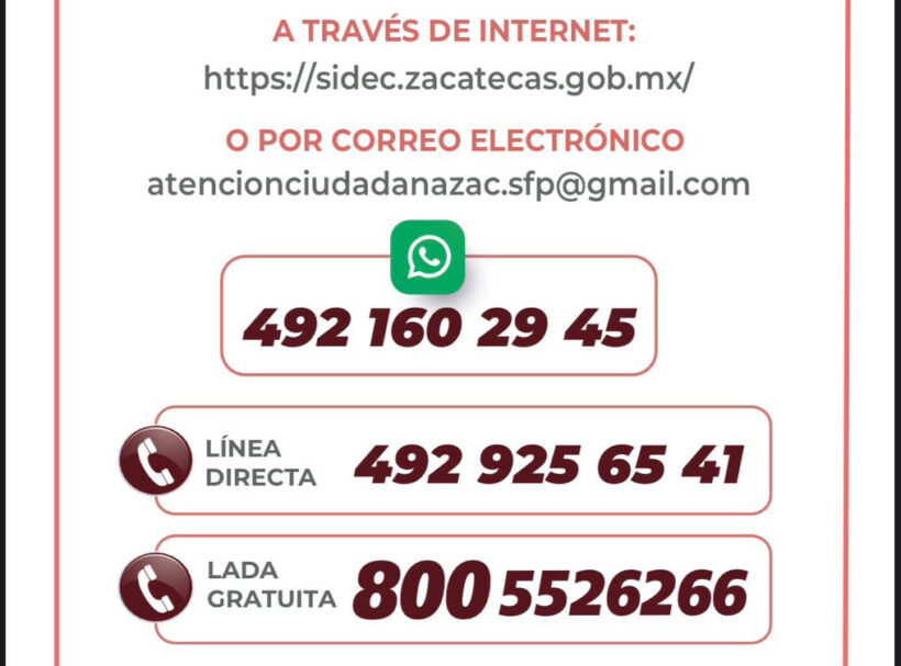 De igual manera, el correo atencionciudadanazac.sfp@gmail.com y los números telefónicos 8005526266 y 4929256541.