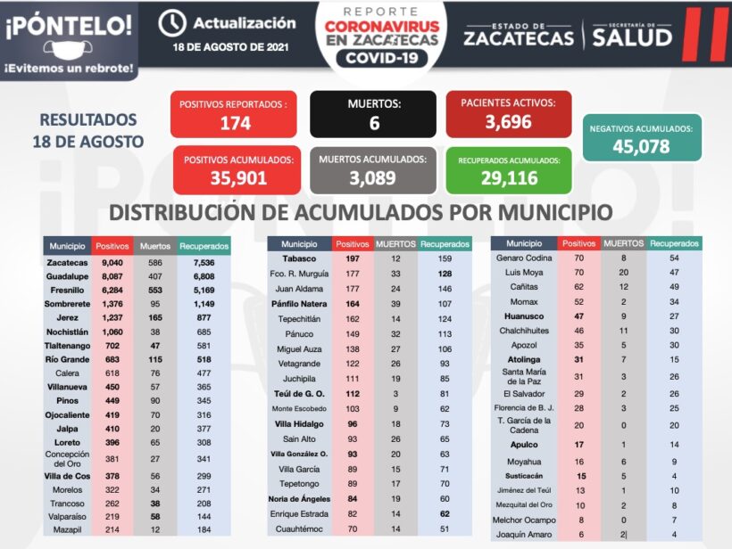 De acuerdo al reporte de la Secretaría de Salud de Zacatecas (SSZ), 174 personas dieron positivo a COVID-19; 64 lograron recuperarse y lamentablemente perdieron la vida seis más. Desde el inicio de la pandemia en la entidad, se han contagiado 35 mil 901 personas, se han recuperado 29 mil 116 y 3 mil 89 fallecieron.