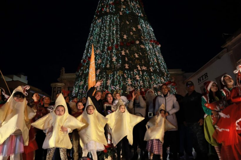 Al ritmo de la Banda Sinfónica del Estado, la Plaza de Armas brilló intensamente con el encendido del monumental Árbol de Navidad, rodeado por la ya tradicional Villa Navideña, un circuito compuesto por casi 20 establecimientos locales que ofrecen alimentos, bebidas calientes, postres y productos propios de la época.