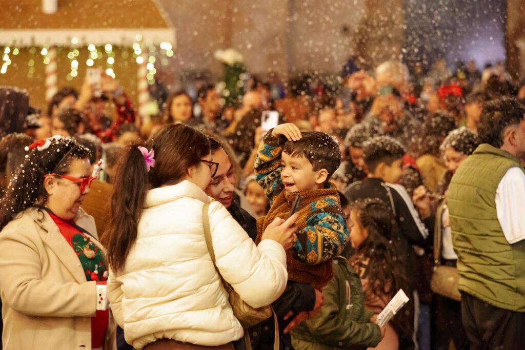 El ambiente se complementa con un carrusel iluminado y una gran cabaña navideña que alberga un café–restaurante donde las familias pueden reunirse para capturar fotografías llenas de espíritu navideño, luces cálidas y escenarios ideales para compartir en redes sociales.
