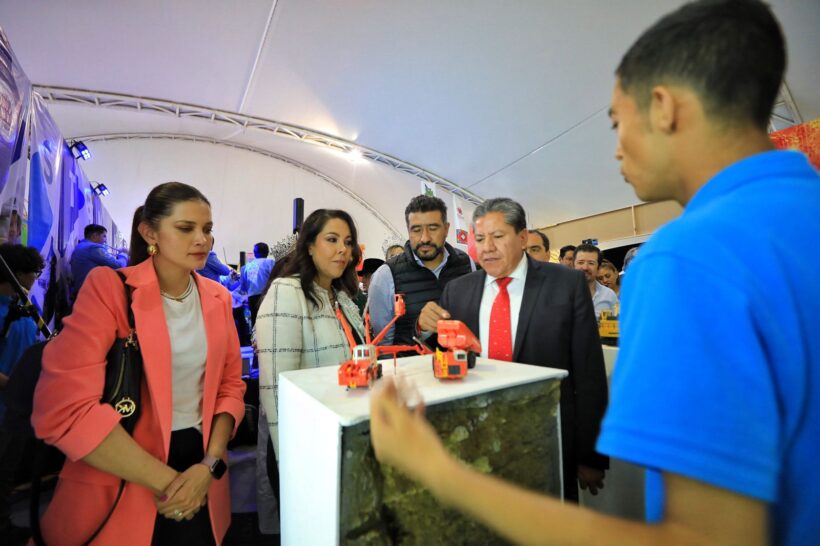 Acompañado del Secretario de Economía, Rodrigo Castañeda Miranda; de Sergio Flores, presidente del Clúster Minero, y de gerentes de empresas mineras, el mandatario estatal recorrió el Pabellón Minero, instalado dentro de la Megavelaria.