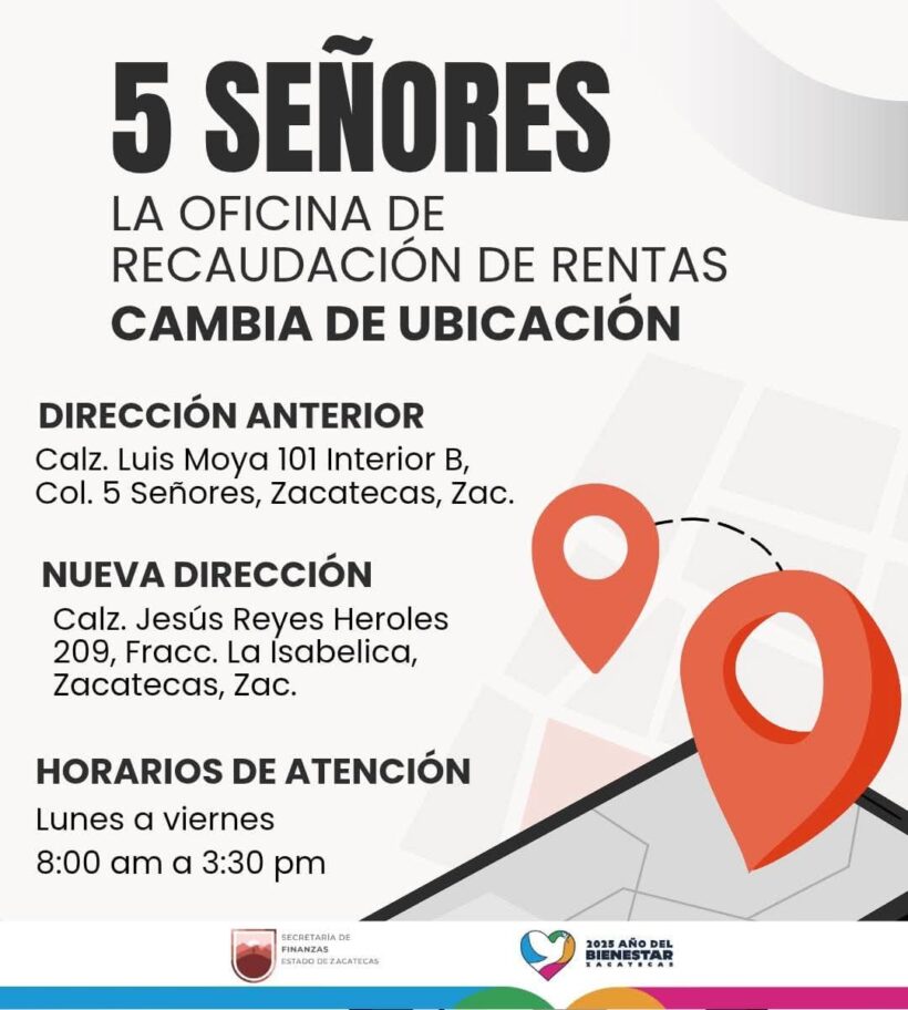 En cumplimiento a la instrucción del Gobernador David Monreal Ávila de fortalecer la atención a la ciudadanía y acercar los servicios públicos con orden y eficiencia, la Secretaría de Finanzas informa sobre el cambio de ubicación de diversas Oficinas de Recaudación de Rentas en el estado.