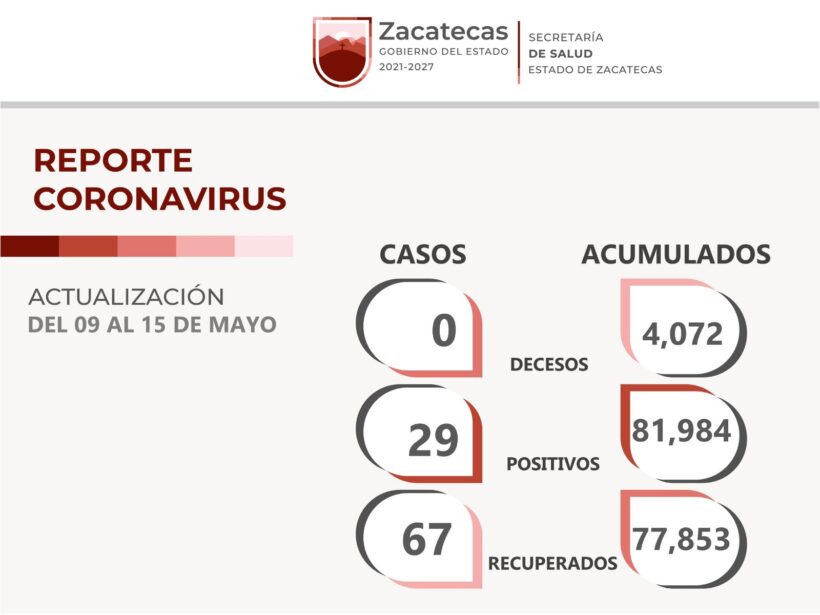 Del 09 al 15 de mayo, la Secretaría de Salud de Zacatecas (SSZ) reportó a 67 personas que superaron la COVID-19, 29 casos positivos y ningún deceso relacionado con el coronavirus.