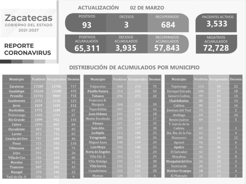 Los fallecimientos – que ocurrieron entre el 13 de febrero y el 1 de marzo- fueron de dos hombres de 42 y 76 años, vecinos de Jerez y Fresnillo, respectivamente. Ninguno presentaba comorbilidad. También murió una fresnillense de 64 años, quien padecía diabetes, hipertensión e insuficiencia renal. El total acumulado en este rubro es de 3 mil 935.