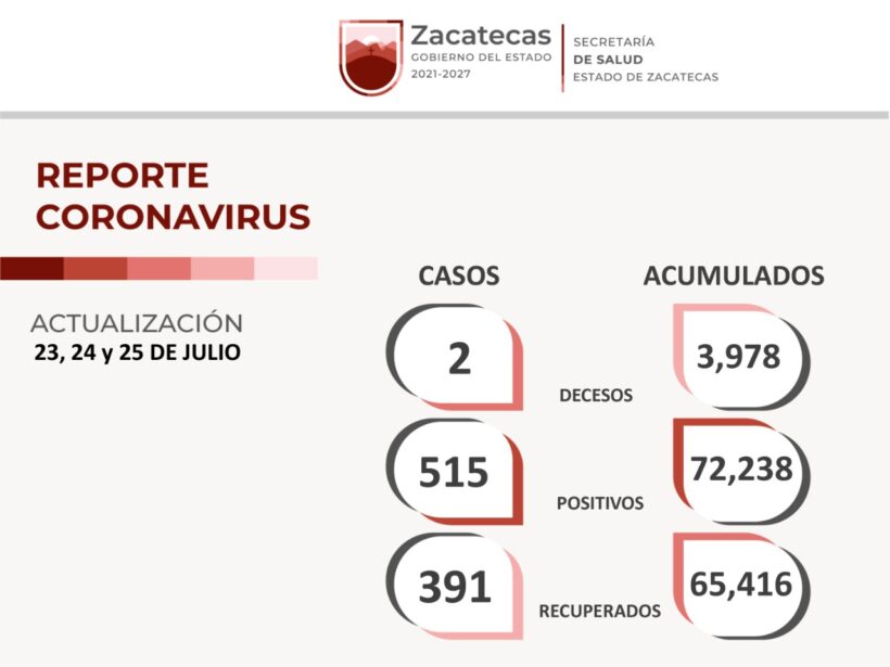 Del 23 al 25 de julio, la Secretaría de Salud de Zacatecas (SSZ) contabilizó 515 nuevos casos de COVID-19, a 391 personas declaradas libres del virus y dos fallecimientos relacionados con éste. Con ello, son 72 mil 238 positivos confirmados, 65 mil 416 los recuperados y 3 mil 978 decesos.