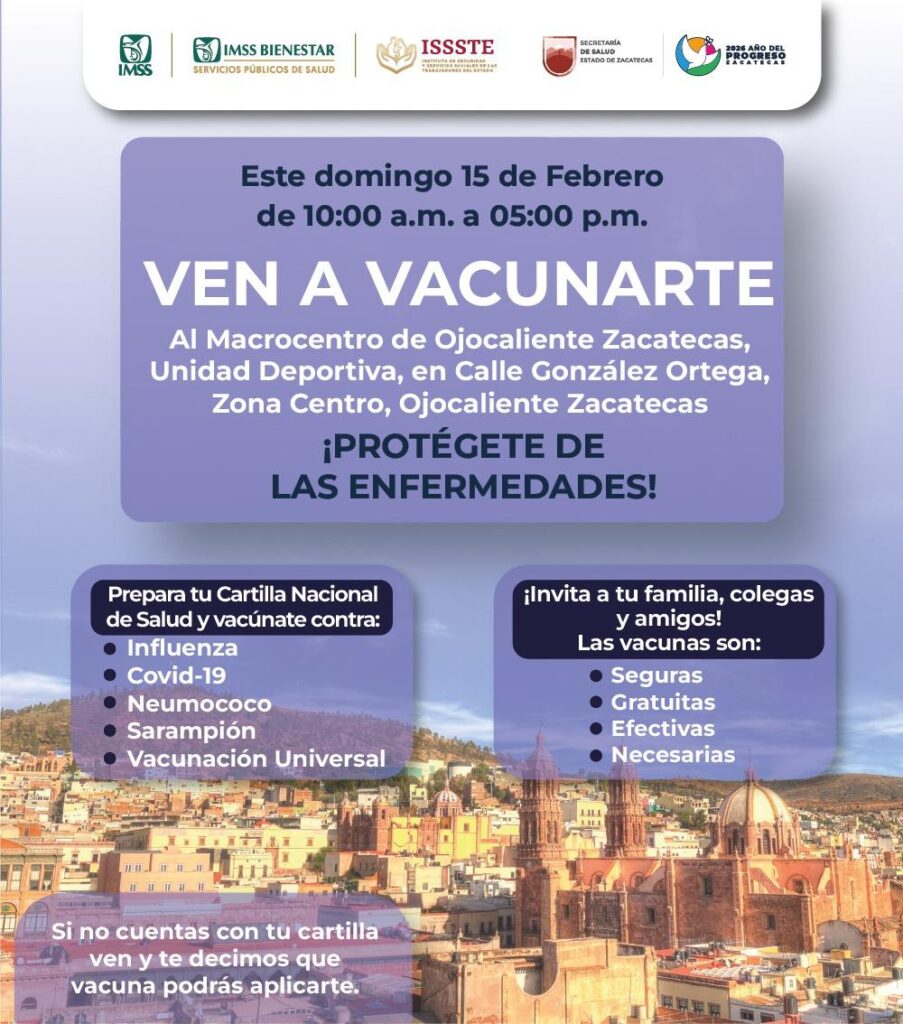 Como parte de la Agenda del Progreso y con el propósito de que la totalidad de las zacatecanas y zacatecanos completen su esquema de vacunación, la administración estatal, encabezada por el Gobernador David Monreal Ávila, por medio de la Secretaría de Salud (SSZ), lleva a cabo una estrategia, a través de la cual se instalarán tres macrocentros, este domingo 15 de febrero, en los municipios de Guadalupe, Fresnillo y Ojocaliente.