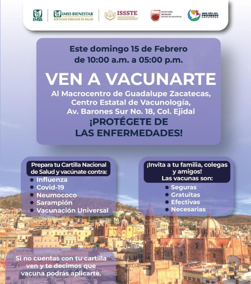 Como parte de la Agenda del Progreso y con el propósito de que la totalidad de las zacatecanas y zacatecanos completen su esquema de vacunación, la administración estatal, encabezada por el Gobernador David Monreal Ávila, por medio de la Secretaría de Salud (SSZ), lleva a cabo una estrategia, a través de la cual se instalarán tres macrocentros, este domingo 15 de febrero, en los municipios de Guadalupe, Fresnillo y Ojocaliente.