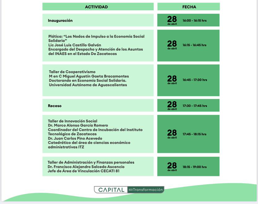 Las pláticas y talleres estarán coordinados en conjunto por la Secretaría de Desarrollo Económico, el Instituto Nacional de Asociativismo y Economía Social (INAES), el CECATI 81 y el Instituto Tecnológico de Zacatecas.