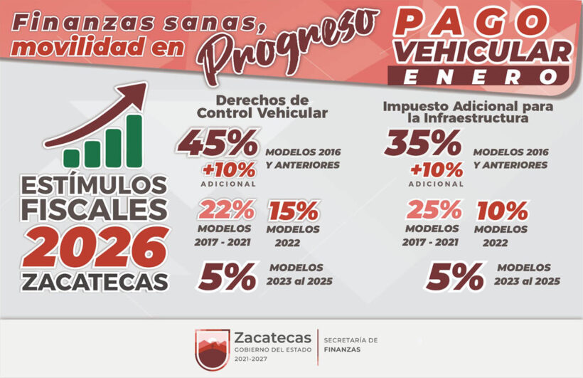El Gobierno de Zacateacas, a través de la Secretaría de Finanzas que encabeza Ruth Angélica Contreras Rodríguez, informa sobre los estímulos fiscales vigentes durante enero de 2026, orientados a facilitar el cumplimiento de las obligaciones vehiculares y apoyar la economía de las familias.