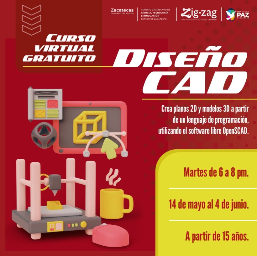 El curso de Diseño CAD se realizará los martes, de 18:00 a 20:00 horas, del 14 de mayo al 4 de junio. Aprenderán a crear planos 2D y modelos 3D a partir de un lenguaje de programación, utilizando el software libre Open SCAD. Es necesario que el participante tenga computadora o laptop y conexión a Internet.