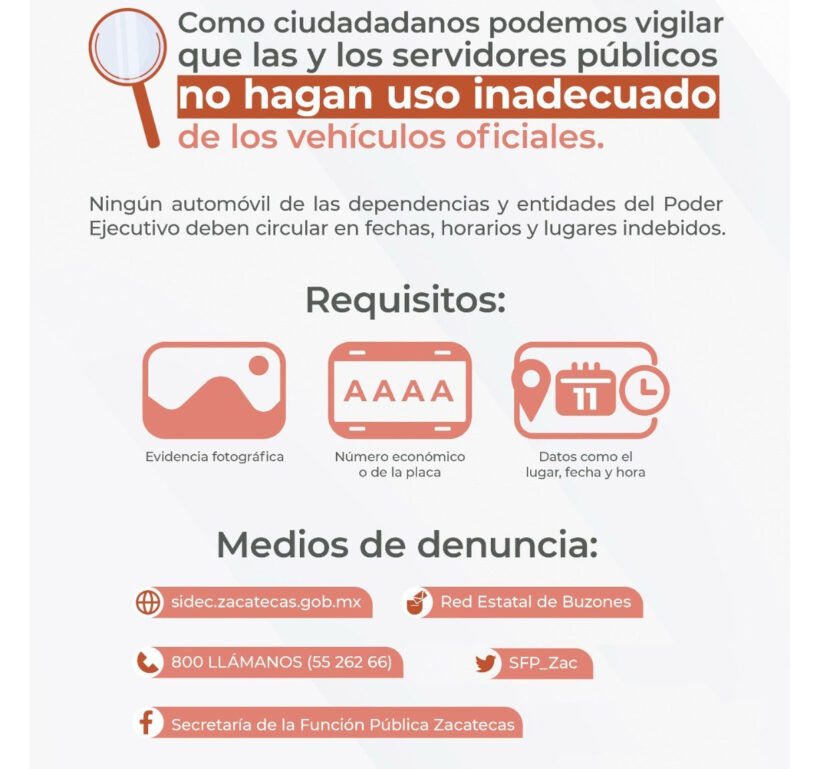 El Gobierno de Zacatecas, a través de la Secretaría de la Función Pública (SFP), lleva a cabo el operativo ¡Denúncialo ya! durante las vacaciones navideñas, con el objetivo de evitar el mal uso del padrón vehicular de la administración estatal.