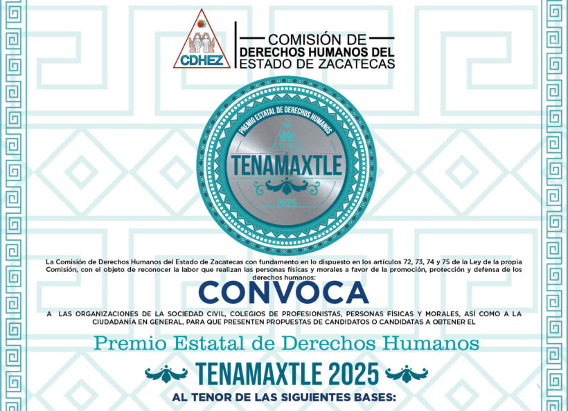 La Comisión de Derechos Humanos del Estado de Zacatecas (CDHEZ), a través de su presidenta, Dra. Maricela Dimas Reveles, hace un llamado a organizaciones de la sociedad civil, colegios de profesionistas y ciudadanía en general para participar en la convocatoria del Premio Estatal de Derechos Humanos “Tenamaxtle 2025”, el máximo reconocimiento que otorga este organismo.