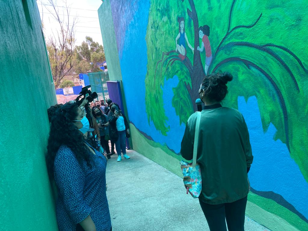 A la par, en uno de los accesos al Zigzag, también fue develado el mural de la artista gráfica zacatecana, Catherine Zúñiga, en el que muestra cuatro escenas referentes al daño causado por el cambio climático y cómo afecta a los seres humanos, especialmente a niñas y niños, trabajo que queda en las instalaciones como una huella permanente del paso del colectivo por el Cozcyt.