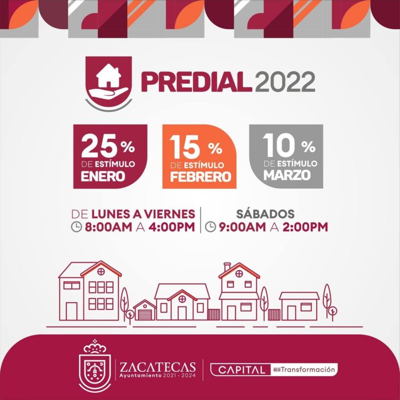 Durante los meses de enero, febrero y marzo, el municipio de Zacatecas hará descuentos importantes a quienes acudan al pago del predial del año 2022, así lo dio a conocer el subsecretario de Finanzas, Adolfo Dávila.