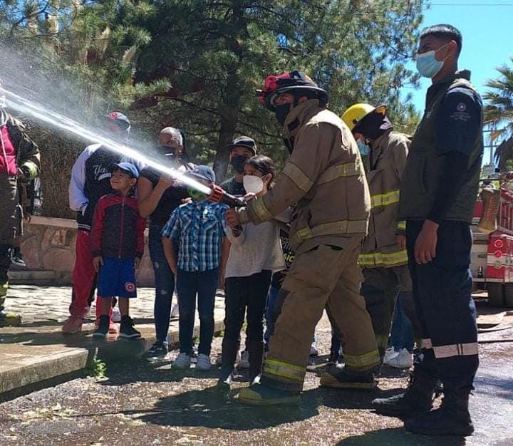 Además, la corporación impartió pláticas sobre medidas contra incendios; mientras que algunas niñas y niños pudieron acceder al camión de la dirección para conocer su funcionamiento.