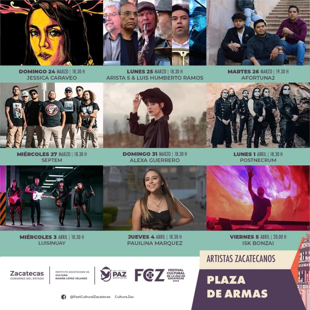 Enmarcado en la Agenda 2024, Año de la Paz en Zacatecas, del 23 de marzo al 6 de abril, distintos foros y espacios emblemáticos de la capital del estado serán sede de las artes y la cultura, con la celebración de la 38 edición del Festival Cultural Zacatecas 2024.
