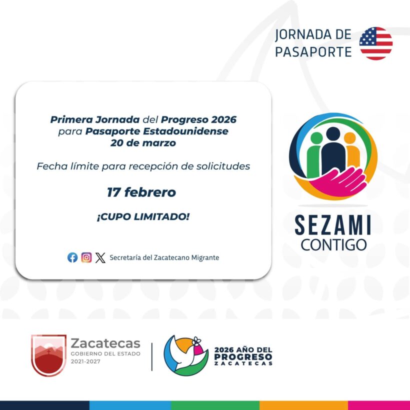 Como resultado a las gestiones del Gobernador David Monreal Ávila ante los Consulados Generales de Estados Unidos (EE.UU.) en Guadalajara y Monterrey, la administración estatal, a través de la Secretaría del Zacatecano Migrante (Sezami), llevarán a cabo las Primeras Jornadas del Progreso 2026 para Entrevistas a una pensión del Seguro Social Norteamericano y Pasaporte Estadounidense.