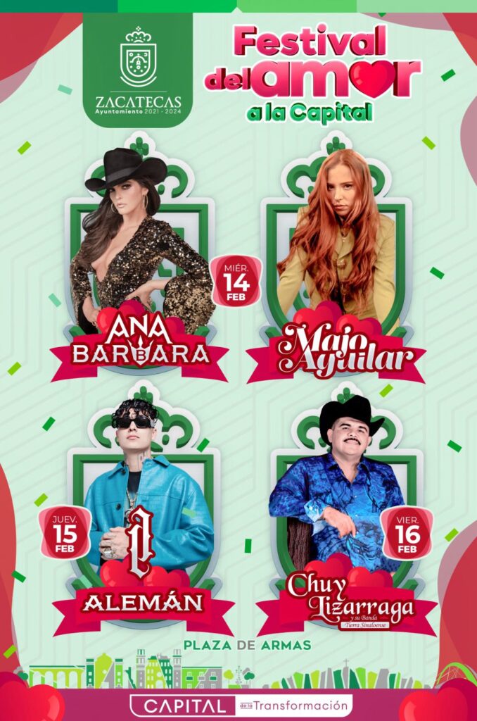 El festival iniciará el miércoles 14 de febrero con la presentación de la cantante Ana Bárbara, así como la actuación especial de Majo Aguilar; las actividades continuarán el jueves 15 de febrero con la llegada del rapero Alemán.