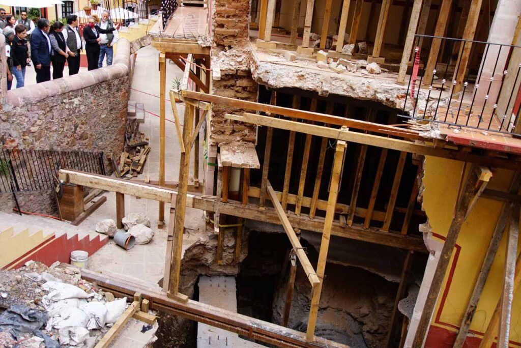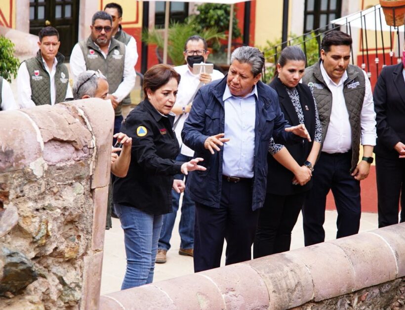 Posteriormente, se dirigieron a una de las áreas donde se fracturó una de las bóvedas en el Centro Histórico de la ciudad, justamente donde se ubica el Hotel Mesón de Jobito. Ahí, el mandatario estatal informó que, en conjunto con Protección Civil Nacional y Estatal, se atenderá y se dará solución a esta añeja problemática.