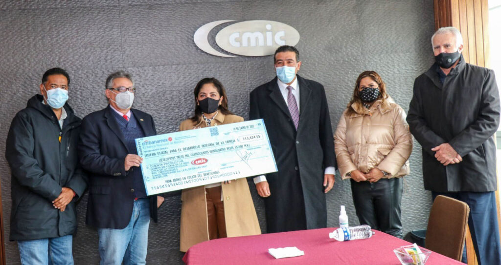 Integrantes de la Cámara Mexicana de la Industria de la Construcción (CMIC), delegación Zacatecas, entregaron a la Presidenta Honorífica del Sistema Estatal para el Desarrollo Integral de la Familia (SEDIF), un donativo en efectivo de 750 mil pesos y 100 cobijas, con el propósito de contribuir y fortalecer los programas Abrigando a Zacatecas con Amor y Alimentando a Zacatecas con Amor.