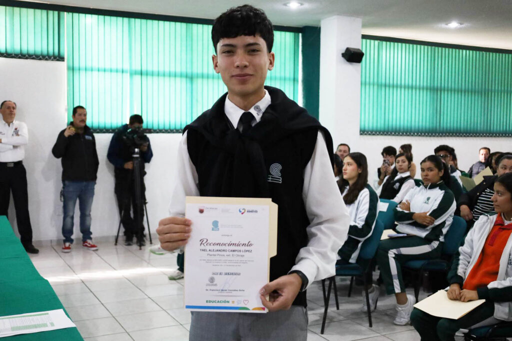 De igual forma, se reconoció a las y los estudiantes Luis Gabriel Serna Alfaro, Moisés Antonio Herrada Montoya, Adriana Dafne Espinoza Romo, ganadores del primer lugar en la Feria de Ciencias e Ingeniería Bienestar 2025, en la categoría Nivel Medio Superior, con el proyecto Invernadero sistematizado con materiales reciclados.