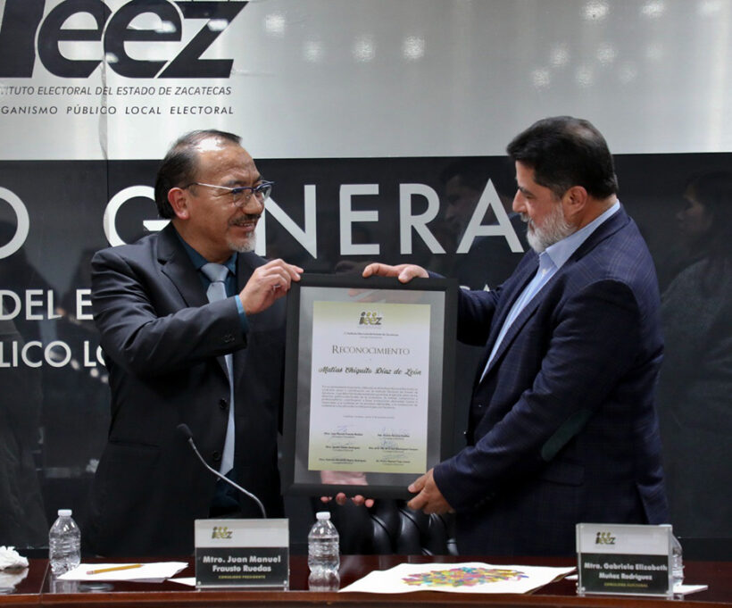 En un emotivo acto, el Instituto Electoral del Estado de Zacatecas rindió un merecido reconocimiento al Vocal Ejecutivo de la Junta Local del INE en Zacatecas, Matías Chiquito Díaz de León, por su destacada trayectoria de más de 35 años en la función electoral, con motivo de su retiro, efectivo al 31 de diciembre del presente año. Durante su intervención, el Consejero Presidente, Juan Manuel Frausto Ruedas, destacó que el trabajo desarrollado por Chiquito Díaz de León permitió fortalecer la coordinación interinstitucional entre el IEEZ y la Junta Local del INE, gracias a la disposición y compromiso de ambas instituciones, lo que se tradujo en una colaboración eficaz que ha sido reconocida a nivel nacional como una de las experiencias de mayor coordinación entre autoridades electorales.
