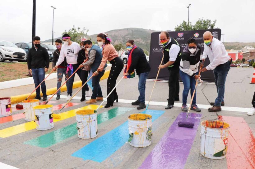 En el marco conmemorativo del mes del Orgullo LGBTTTIQ, el Ayuntamiento de Zacatecas encabezado por el alcalde Salvador Estrada González refrendó su compromiso de seguir respaldando a la comunidad con acciones afirmativas, tal es el caso de la pinta de señalética vial con los colores del arcoiris sobre el paso peatonal que da acceso a Plaza Tahona en la avenida García Salinas, donde colaboradores y asociaciones civiles demostraron que la Capital es un municipio incluyente y progresista.