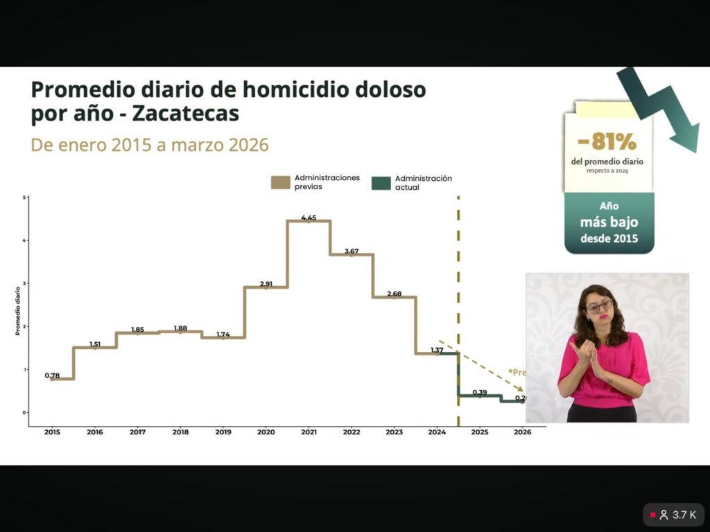 En La Mañanera del Pueblo, encabezada por la Presidenta de México, Claudia Sheinbaum Pardo, el Secretariado Ejecutivo del Sistema Nacional de Seguridad Pública (SESNSP) destacó a Zacatecas con una reducción del 89 por ciento en el promedio diario de homicidios dolosos, en la comparación de noviembre de 2024 con marzo de 2026, al pasar de 1.47 a 0.16 casos por día.