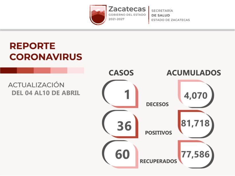 La Secretaría de Salud de Zacatecas (SSZ) informó que, en la semana del 4 al 10 de abril, contabilizaron 60 pacientes recuperados de COVID-19, a 36 nuevos casos positivos y un fallecimiento atribuido al coronavirus, en todo el territorio estatal.