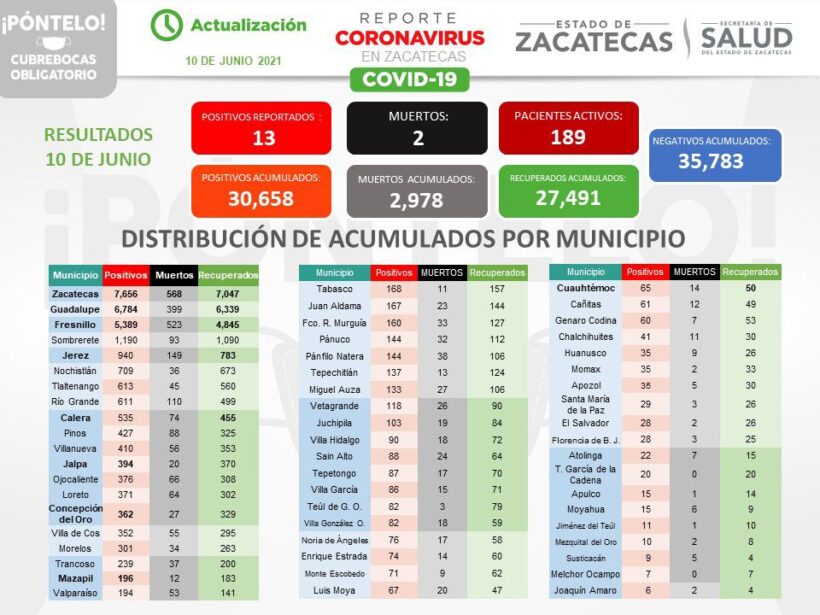 REPORTAN 13 ZACATECANOS MÁS CONTAGIADOS DELCOVID-19