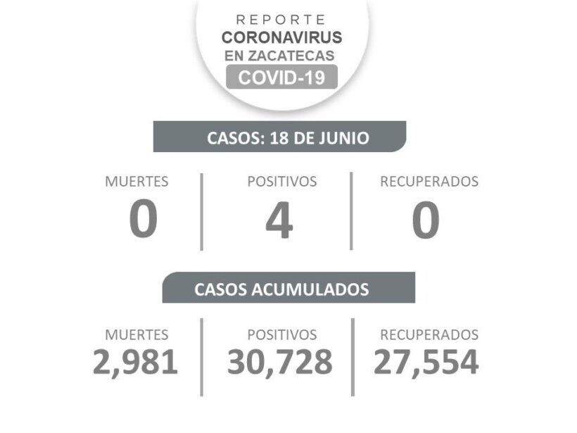 La Secretaría de Salud de Zacatecas (SSZ) informó que, este viernes, no se registraron defunciones, ni pacientes recuperados de COVID-19; sólo se reportaron cuatro nuevos contagios.