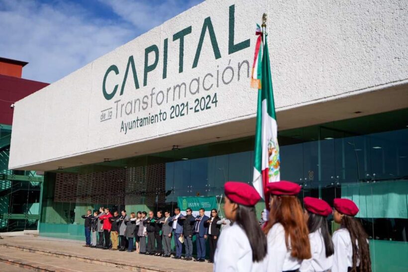 El alcalde, Jorge Miranda Castro, encabezó la ceremonia de Honores a la Bandera en la explanada de la Presidencia Municipal de Zacatecas.