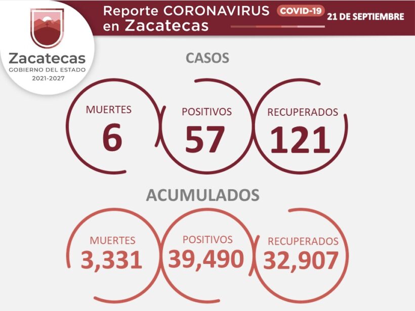 Este día, la Secretaría de Salud de Zacatecas (SSZ) reportó seis fallecimientos y 57 nuevos contagios de COVID-19, así como 121 personas dadas de alta tras superar la enfermedad.