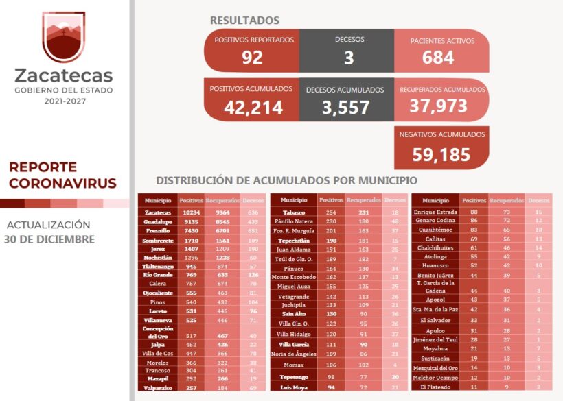 La Secretaría de Salud de Zacatecas informó que tres personas perdieron la vida a causa del COVID-19: una mujer de Tepetongo, de 51 años, quien falleció este jueves 30 de diciembre y padecía hipertensión arterial sistémica y obesidad.