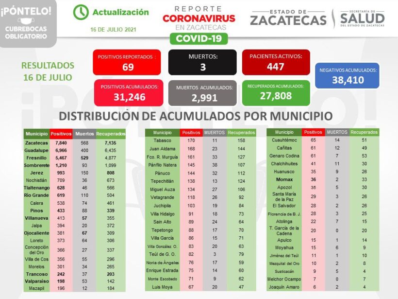 La Secretaría de Salud de Zacatecas (SSZ) informó de 69 nuevos casos positivos de COVID-19 en el estado, en las últimas 24 horas; tres muertes más causadas por la enfermedad y nueve personas declaradas libres del virus.