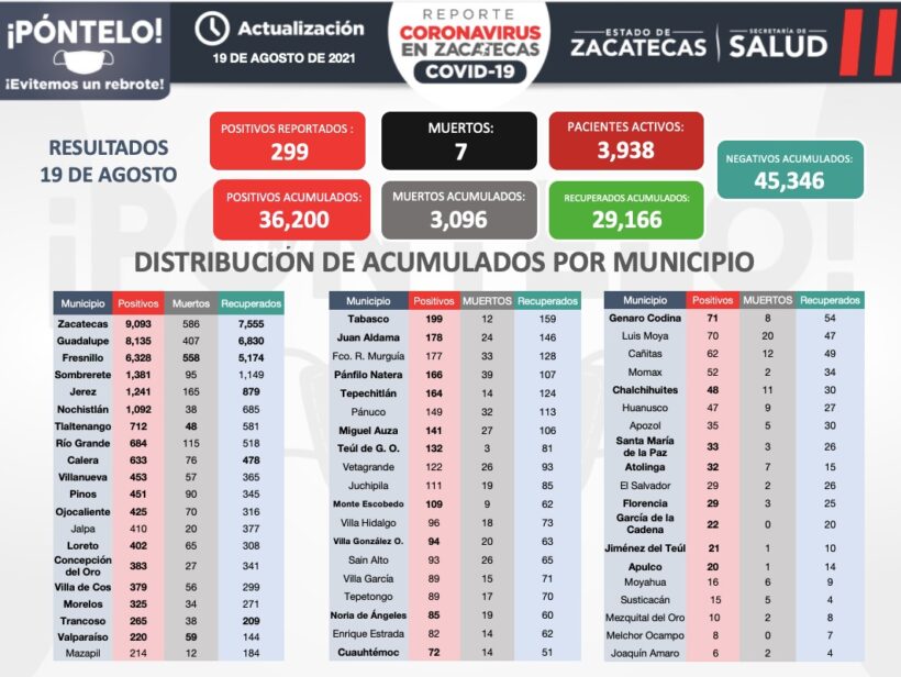 Este jueves, la Secretaría de Salud de Zacatecas (SSZ) reportó 299 nuevos contagios de COVID-19; 50 recuperados y siete fallecimientos.
