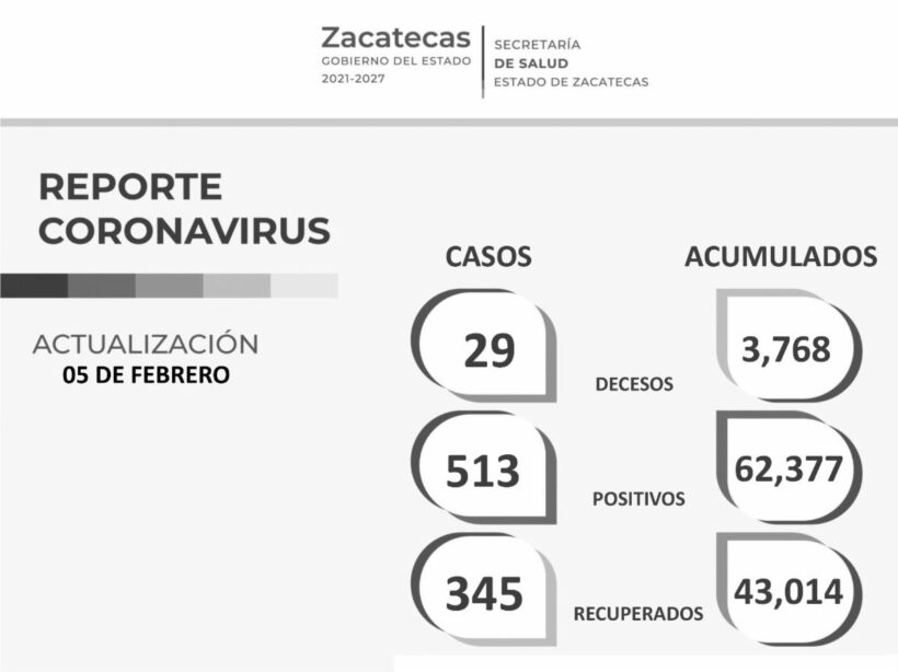 Con los nuevos casos positivos de este día –de los cuales, todos pasan la enfermedad en sus domicilios- Zacatecas suma 62 mil 377. Sus edades van de los 11 meses a 91 años; son 280 mujeres y 233 hombres. En 413 de los contagios la modalidad fue comunitaria.
