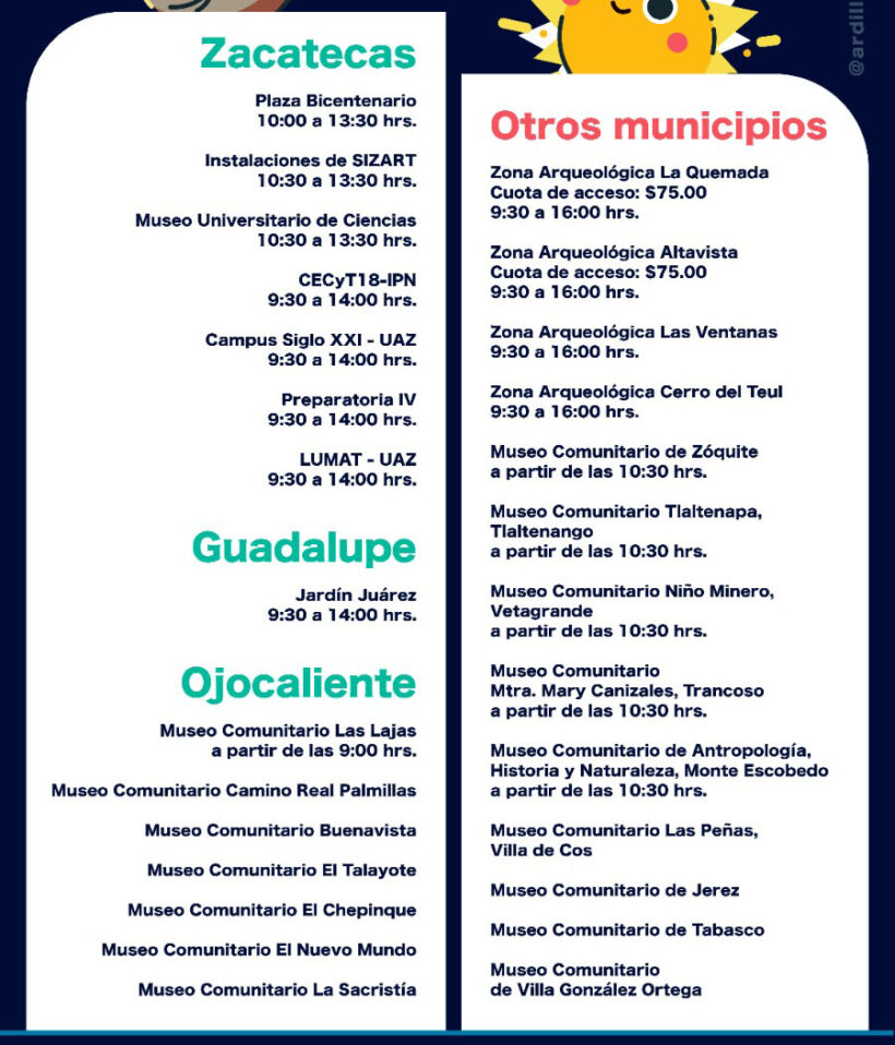 En tanto, en la cabecera municipal de Guadalupe, se habilitará el Jardín Juárez como el espacio de observación, así como esoqxios de los museos comunitarios de Zóquite, Jerez, Tabasco, Villa González Ortega; también, en los museos comunitarios de Tlaltenapa, Tlaltenango; Niño Minero, en Vetagrande; Las Peñas, en Villa de Cos; Mary Canizalez, en Trancoso; y de Antropología, Historia y Naturaleza, en Monte Escobedo.