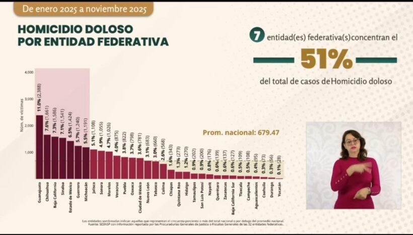 A nivel nacional, según la estadística de las 32 Procuradurías y Fiscalías estatales, el promedio diario de homicidios dolosos se redujo de 86.9 casos en septiembre de 2024 a 54.7 en noviembre de 2025, lo que representa una disminución del 37 por ciento, equivalente a 32 homicidios menos por día.