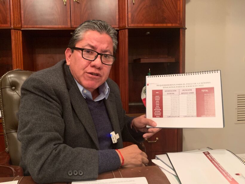Al respecto, el Presidente de la República se comprometió a absorber la nómina magisterial, pero este procedimiento no ha sido posible. Mientras eso sucede, se ha planteado una petición de apoyo a la Federación por 2 mil millones de pesos, para que, en un esfuerzo extraordinario, la aportación estatal sea de 1 mil millones de pesos.