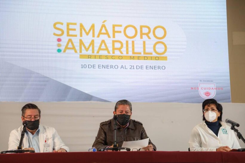 Esta mañana, el Gobernador, acompañado por la titular del Instituto Mexicano del Seguro Social (IMSS) en Zacatecas, Saandra Durán Vázquez; la Secretaria de Educación, Maribel Villalpando Haro, y el Secretario de Salud, Uswaldo Pinedo Barrios, detalló la medidas adoptadas en la reunión extraordinaria del Comité Estatal para la Seguridad en Salud, donde se aprobó, por unanimidad, que el estado adopte el semáforo amarillo – del 10 al 21 de enero- para cortar las cadenas de contagio, ante el crecimiento exponencial de casos positivos, y evitar así la saturación de los hospitales y del personal médico, que ya atiende consultas externas.